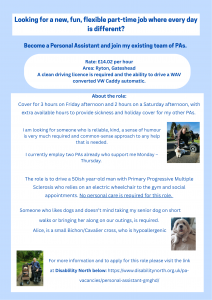 Female personal assistant required for a lady with an acquired head injury in her own home in Hamsterley Mill near Rowlands Gill.