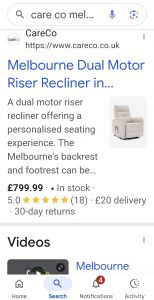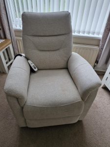 CareCo Melbourne Dual Motor Riser Recliner Chair. The chair is in perfect condition, used for less than a year. The dual motor allows the backrest and footrest to be adjusted independently to find a perfect position and it lifts to ease getting on and off. The plush cushioning in the seat base and the backrest, which includes extra cushioning around the lower back offers extra comfort.